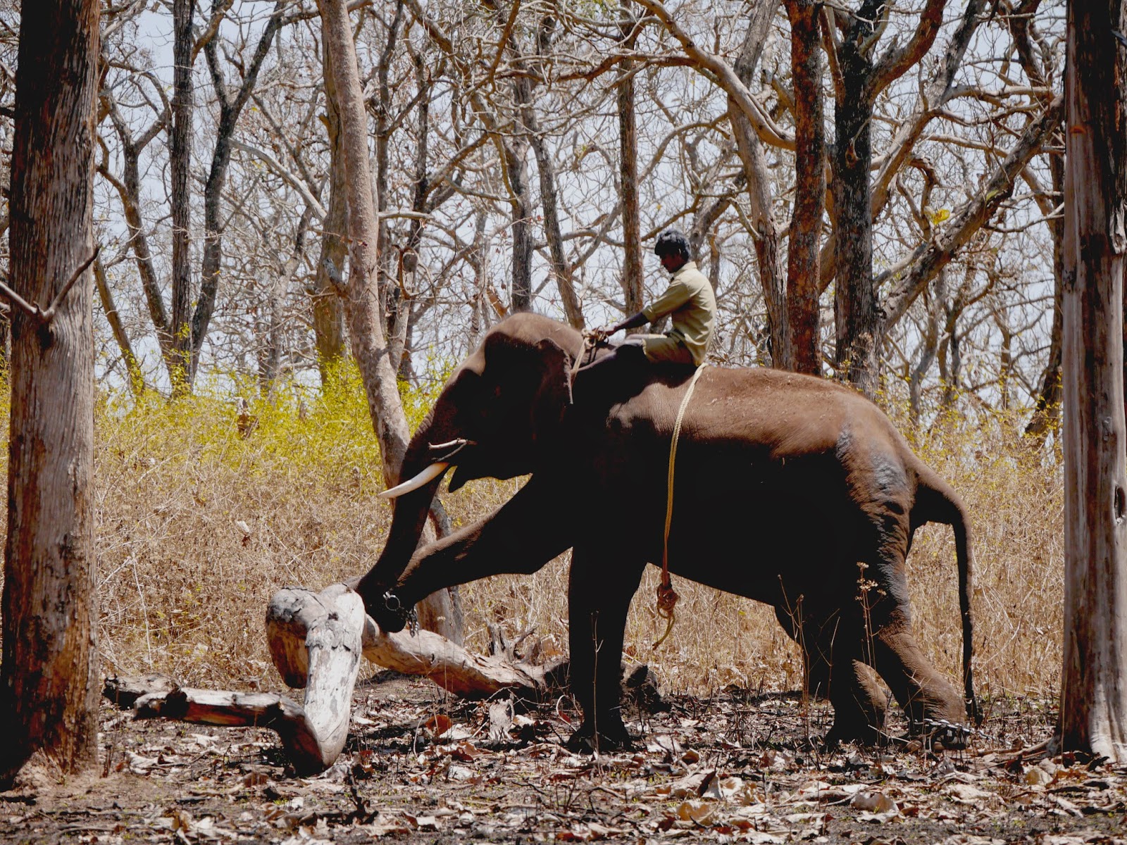 Elephant moving fallen trees in a very dry Mudumalai Tiger Reserve before the monsoons.
